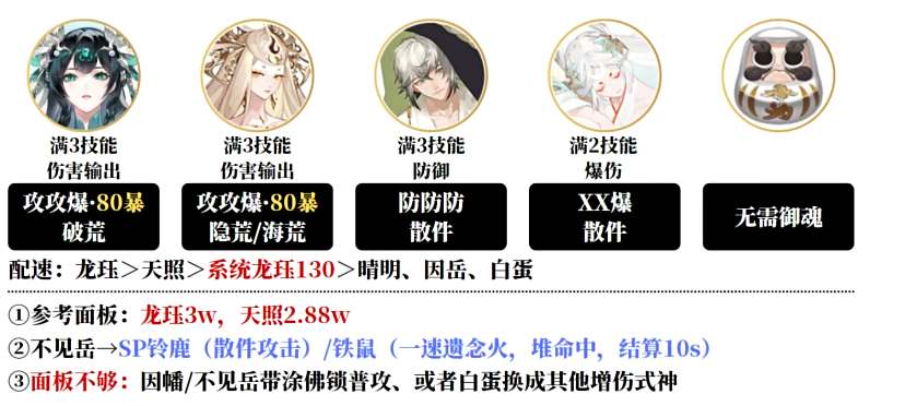 1、高配阵容1:SP铃鹿>龙珏>天照>系统130龙珏>晴明/低速源赖光、初音、祸津神。