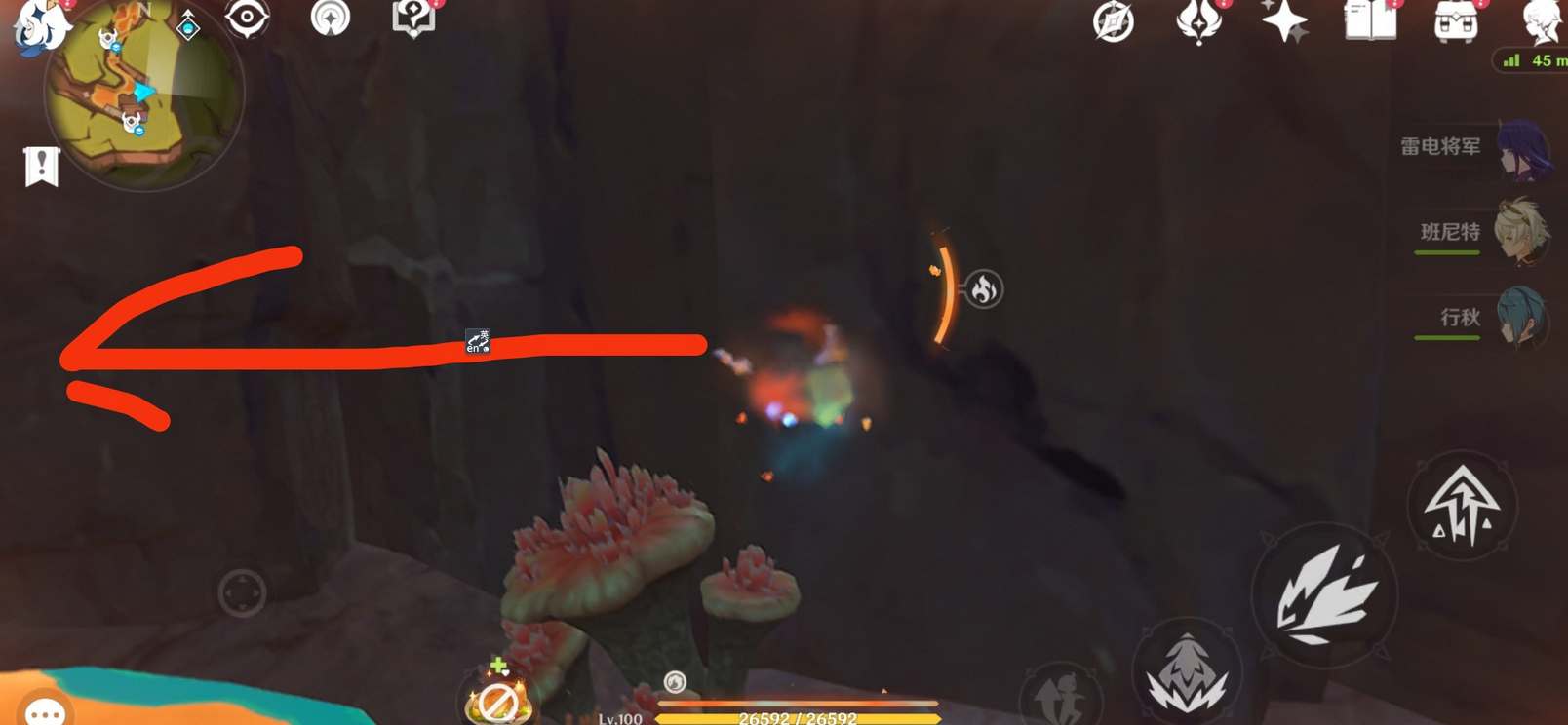 顺着箭头的位置往前钻,拐过一个小弯弯有个交互点,到达后触碰黑石头进入地方传奇挑战地点。