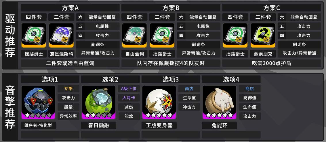 4摇摆爵士+2震星迪斯科,词条六号位能量恢复,五号位电属性,四号位攻击力;