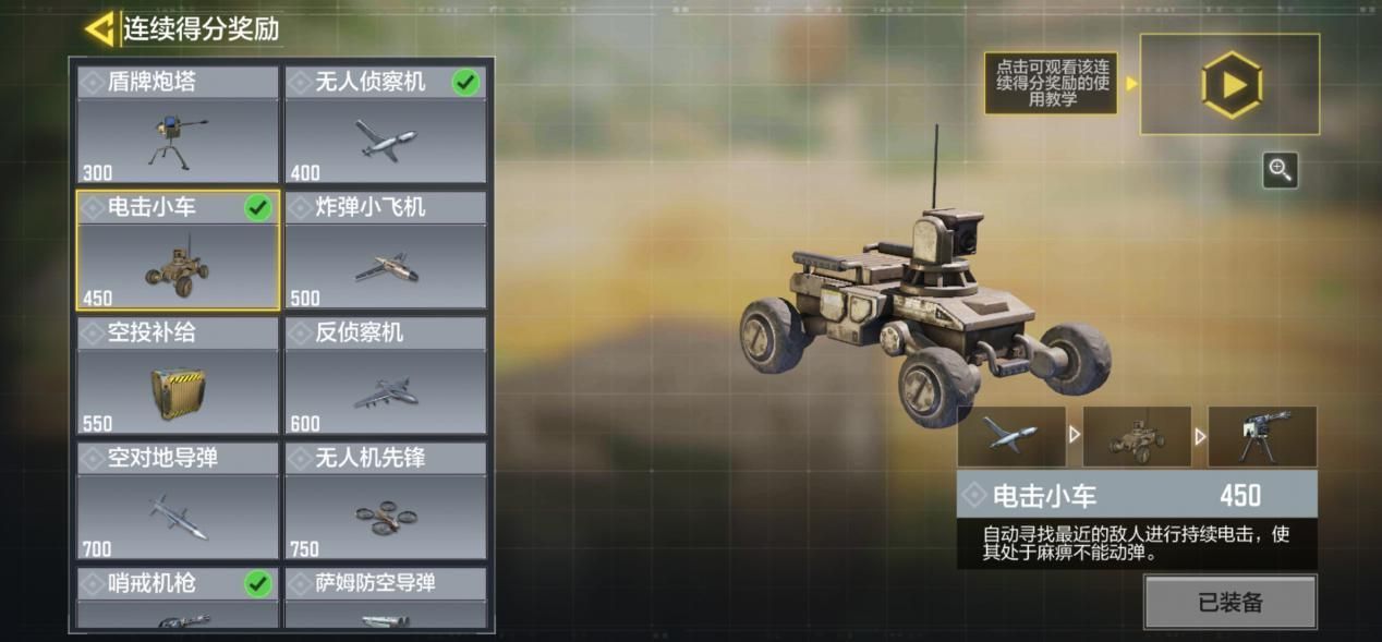连杀技能建议选择可以发现敌人位置的无人侦察机、可以自动寻找并控制敌人的电击小车以及可以自动锁定敌人协助我们封锁一片区域的哨戒机枪。