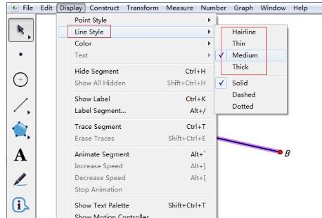 选择左侧的“移动工具”,选中线段AB,单击上方菜单栏“显示”菜单,在其下拉选项选择“线型”——“细线”,如图所示,就能选择好要设置的线的粗细。其实,不仅可以改变线的粗细,也可以改变颜色。