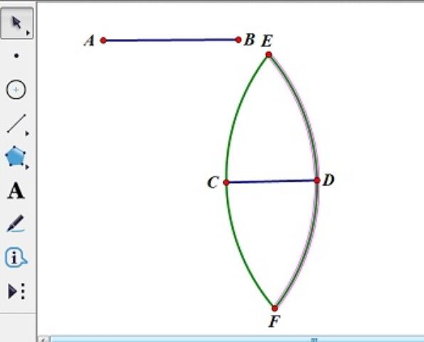 2.构造圆。选中线段AB和点C,选择“构造”—“以圆心和半径绘圆”命令,做出圆C。同样方法绘制圆D。两圆交点为点E、点F。