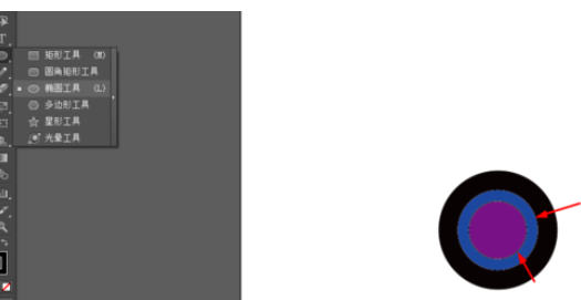 再用椭圆工具,在大圆中间画两个小圆,分别填充蓝色和紫色,