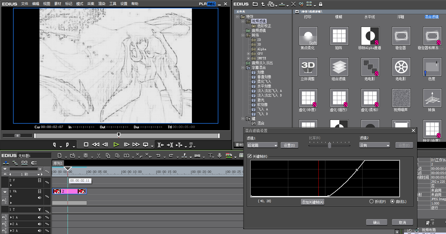 在信息面板处,双击“混合滤镜”,进入其设置对话框。在这将滤镜1选择为“铅笔画”。接着把“关键帧”前面框里打上钩,设置一下关键帧。