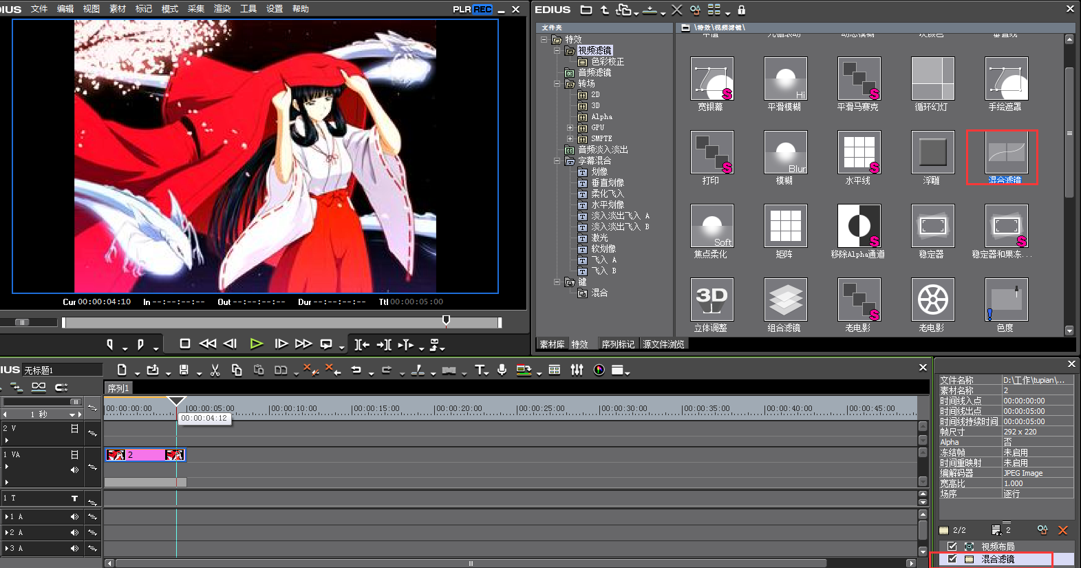 打开特效面板,在特效面板中找到“混合滤镜”,然后将它拖拽到素材上。