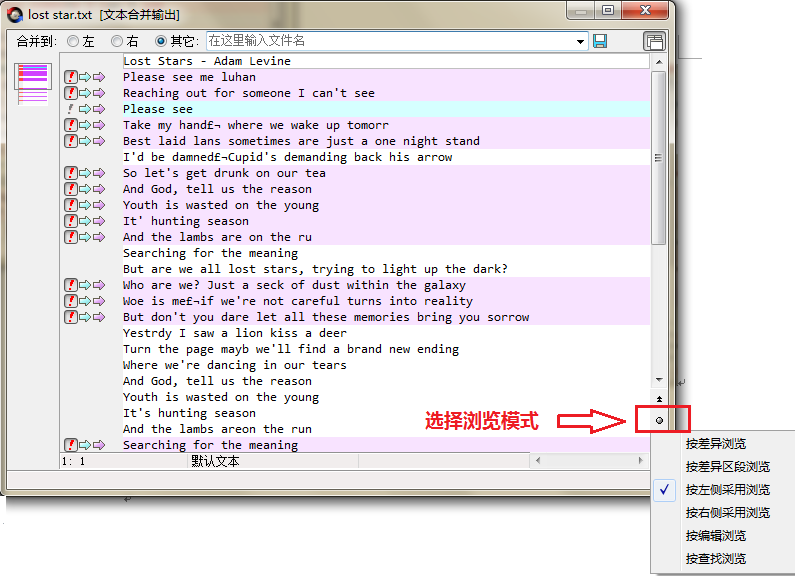 单击下拉菜单底部的“选择浏览模式“圆形图标,展开浏览模式菜单,可选项内容包括:按差异浏览、按差异区段浏览、按左侧采用浏览、按右侧采用浏览、按编辑采用浏览及按查找浏览。