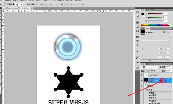 4、点击【自定义形状工具】,按图示设置好各个参数后,在作图区域绘制出一个自定义图案。点击【文字工具】设置好文字大小、字体、颜色等参数后,输入文字内容:SUPER MHSJS(如图所示);
