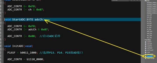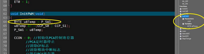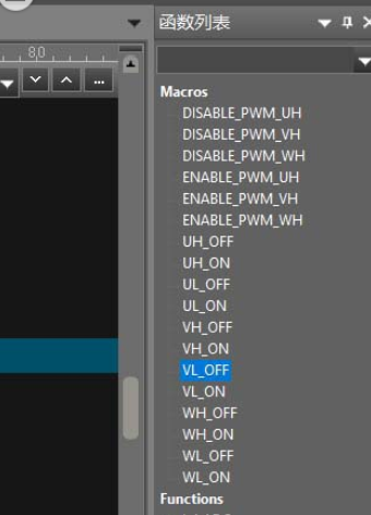 操作成功后,在代码的右侧会显示出一个“函数列表”对话框,当然这个是默认位置,如果之前已经将这个列表拖动到其它位置那么它还会在之前的位置显示。列表中显示了当前被打开的文件中所有的函数、宏以及变量,点击任意一个函数可以快速跳转到该函数的定义位置。